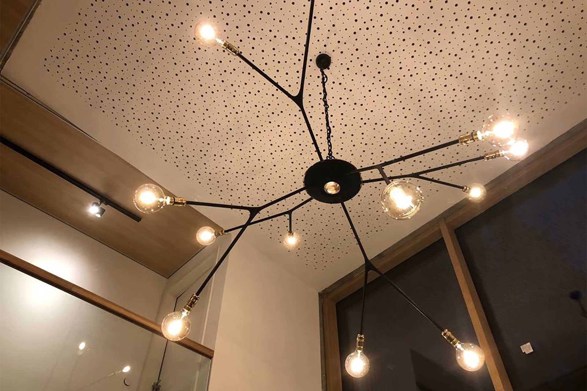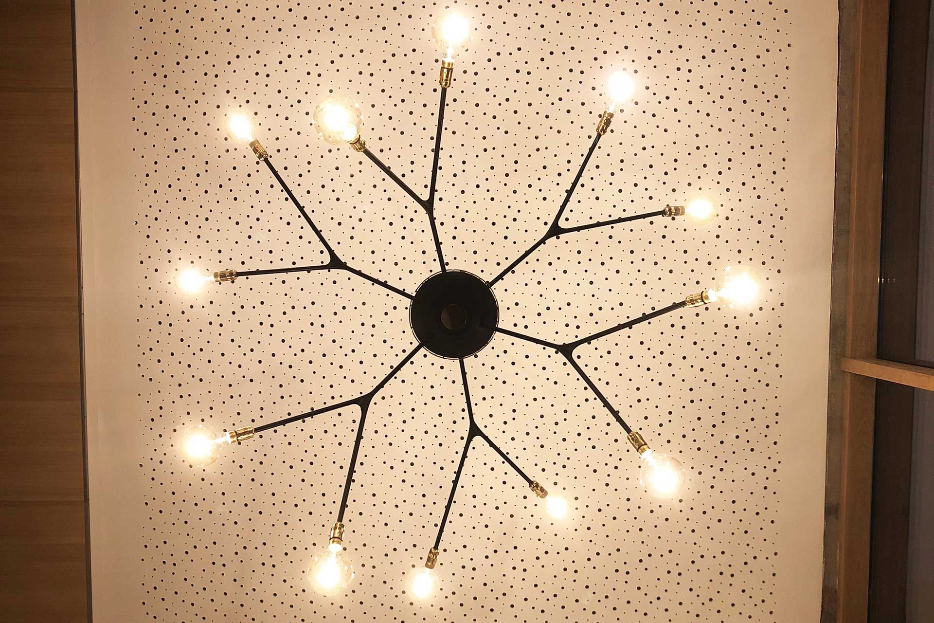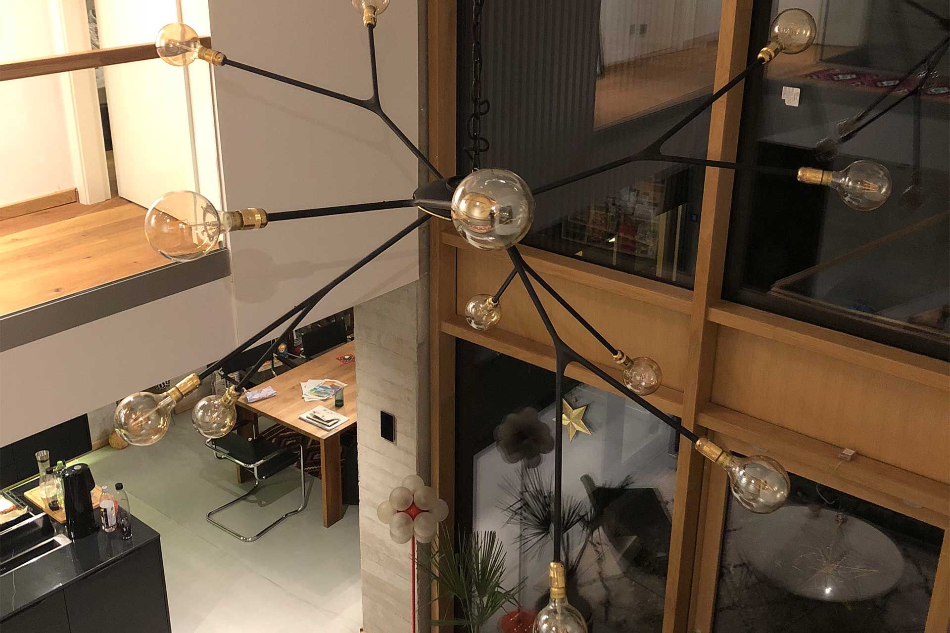 Der Kronleuchter mit einem Durchmesser von 1,80 m besteht aus einer Stahl-PLA-Konstruktion. Die Gelenke hierfür wurden in CAD entworfen und anschließend durch einen 3-D-Drucker erstellt. Vom Lampenzentrum aus werden die 12 Glühbirnen mit Strom versorgt. Durch die Gelenke und der selbstbestimmten Länge der Stahlrohre hat man viele Möglichkeiten, einen individuellen Kronleuchter zu kreieren. Mit jedem Blickwinkel gibt die Lampe ein neues Bild und erzeugt dadurch einen lebendigen Raum. Der dezente Einsatz von Material, Farbe und Form gibt dieser Lampe einen zeitlosen Ausdruck.